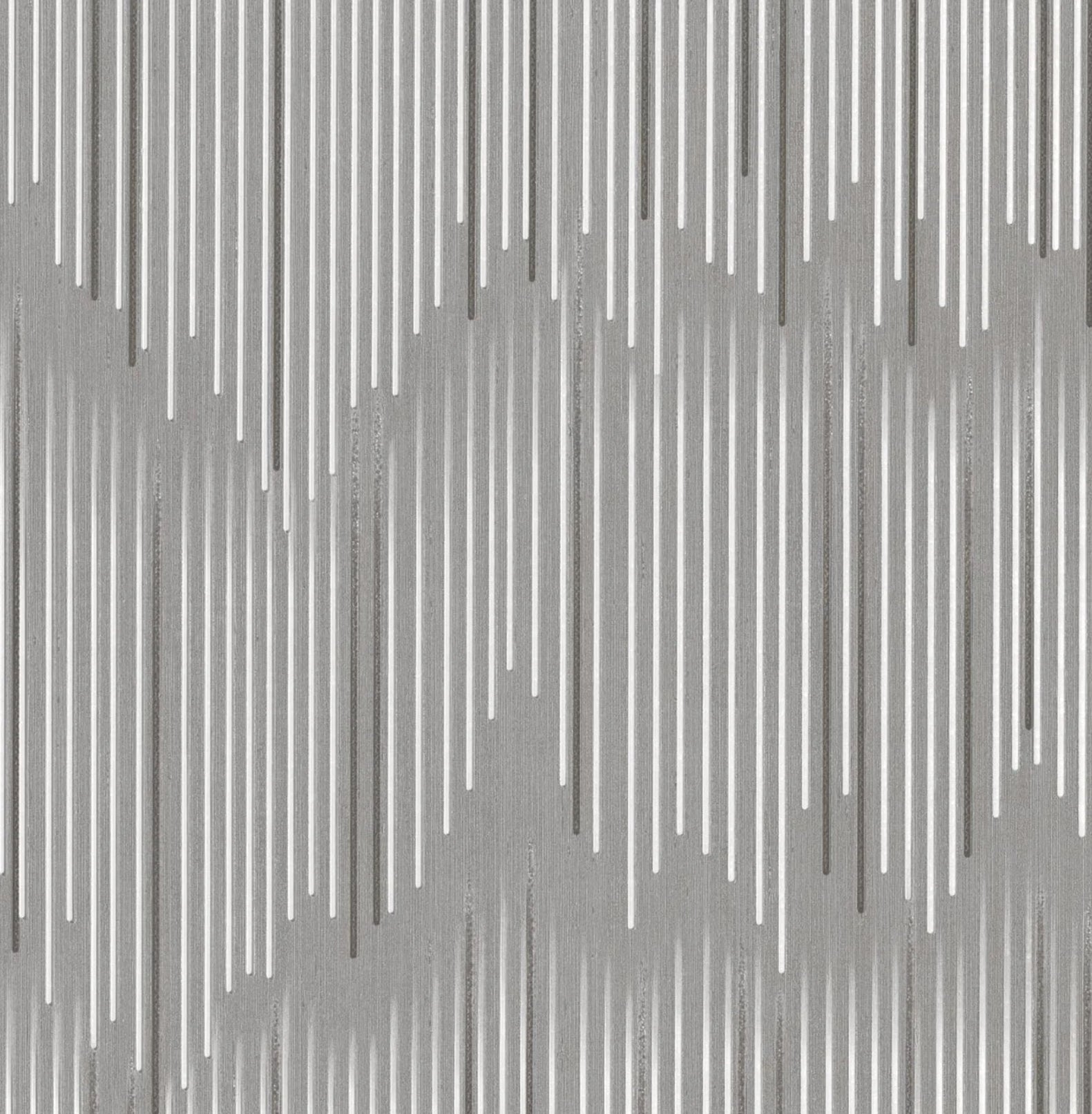 This wallpaper features a sophisticated vertical stripe design with varying widths in silver, set against a dark gray base color. The modern and sleek pattern adds a touch of luxury and style to any space, creating a refined and elegant atmosphere. Each roll measures approximately 41.7 inches by 614.2 inches (178 square feet). Easy to install with adhesive or a pasting machine—no soaking required. For best results, use the special adhesive available in our profile.