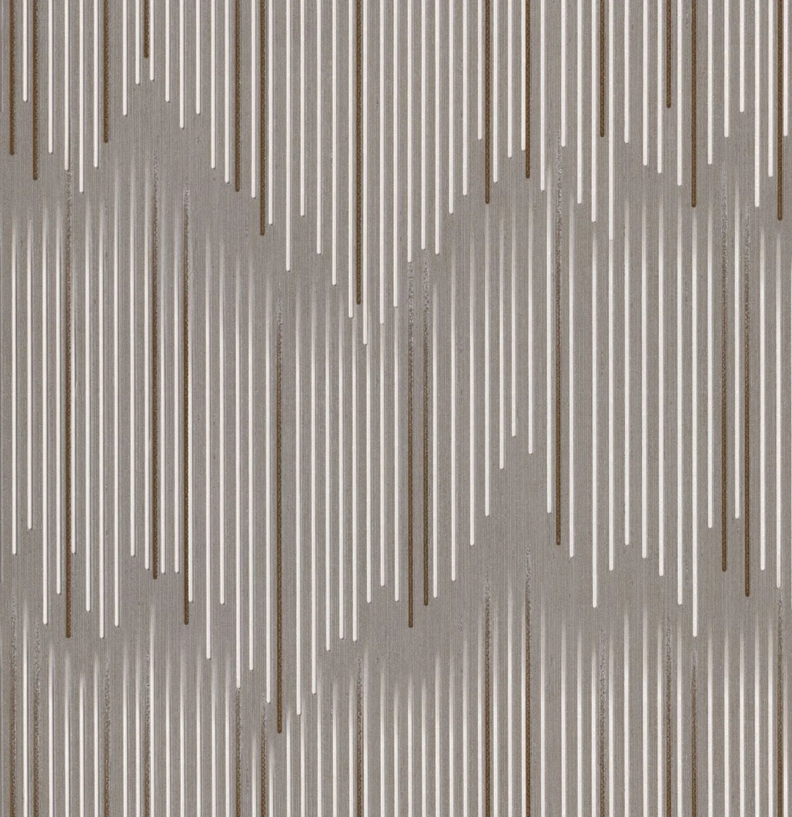 This wallpaper features an elegant striped design with varying widths in cream and gold, set against a sophisticated vison base color. The combination of colors and patterns adds a luxurious and refined touch to any room, creating a stylish and warm atmosphere. Each roll measures approximately 41.7 inches by 614.2 inches (178 square feet). Easy to install with adhesive or a pasting machine—no soaking required. For best results, use the special adhesive available in our profile.
